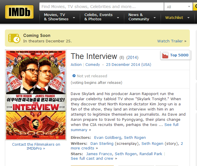 《采访》(《The Interview》)是一部由索尼影视娱乐有限公司在美国拍摄,集喜剧/动作于一身的精彩影片,综合评分为 0.00 。于2014年12月11日(洛杉矶首映)/2014年12月25日(美国)上映,全片时长112分钟。演员阵容:詹姆斯·弗兰科、塞斯·罗根、丽兹·卡潘、Diana Bang、Timothy Simons、James Yi、Paul Bae、Geoff Gustafson、Dominique Lalonde、Anesha Bailey、Anders Holm、Charles Chun、Don Chow、Colin Foo、Larry Hoe、Cleo Yeh、Yuna Song、Michelle Kim、Peenkay Tang、Sarah Yu、Hazeltine Gariza、Willem Jacobson、Daniel Lim、Harrison Lee、Jason Cox、John Coughlin、Peter Neilly、Yoosik Oum、Scott Seol、Daniel Park、Justin Lee、Don Lew、Andrew Chin、Jung Jin Park、Dan Sterling、弗雷德·亨德森、Dan Shea、Tommy Chang、Justin Cho、David Kim、Adrian de Lotz、Hong-Gill Cha、Sean Cho、Dave Ko、Jack Jekeon Cha、Stewart William Bi、Joe Mande、Alice Wetterlund、Stacey Turner、Sam Catlin、Guy Fieri、Danyella Angel、Alan Blumenfeld、Paola Botero、Thomas Cadrot、Steve Chang、David Diaan、Bryce Fishman、Paul Herbert、Daniel Juhn、Nick Kaiser、Daeyoung Danny Kim、Crystal Lee、Jake Won Lee、Mercy Malick、Isaac Shr、Paniz Zade <查看完整演员表>